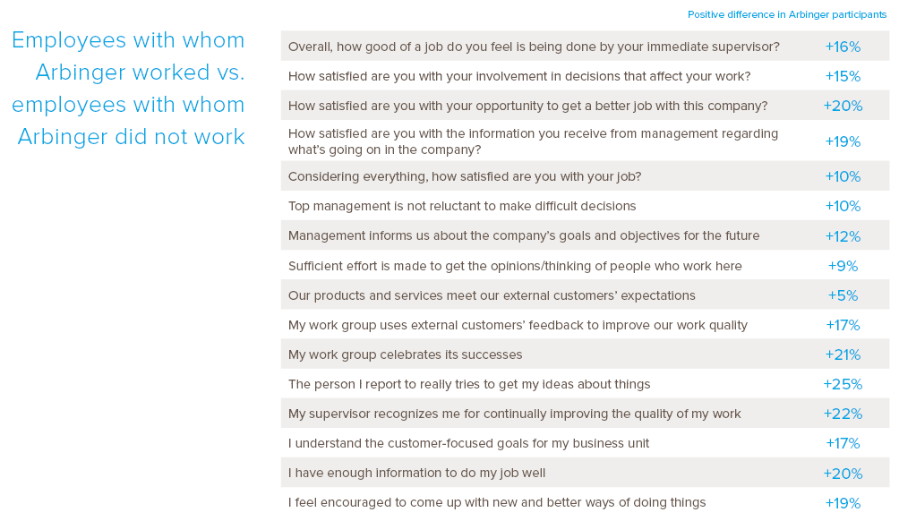 Results of the company’s internal employee survey helped quantify the impact of Arbinger’s work when the responses of employees with whom Arbinger worked were compared to the responses of employees with whom Arbinger did not work. Despite the fact that this survey was conducted more than a year after the Arbinger intervention, those who worked with Arbinger responded more favorably on all questions (see chart below). As a result, despite the difficulties posed by the reorganization, work groups experienced gains in productivity and customers’ needs were proactively anticipated and met. For example, one regional operations manager remarked that, “Without the Arbinger training, I don’t think I’d be able to get any good work from my people at this point. But in spite of the reengineering decisions that are beyond my control, we’re doing some pretty good stuff.” This was not only felt within individual units, but across the division as a whole, leading a corporate officer to say, “We’re getting a lot more done, and we’re doing it a lot faster now.”
