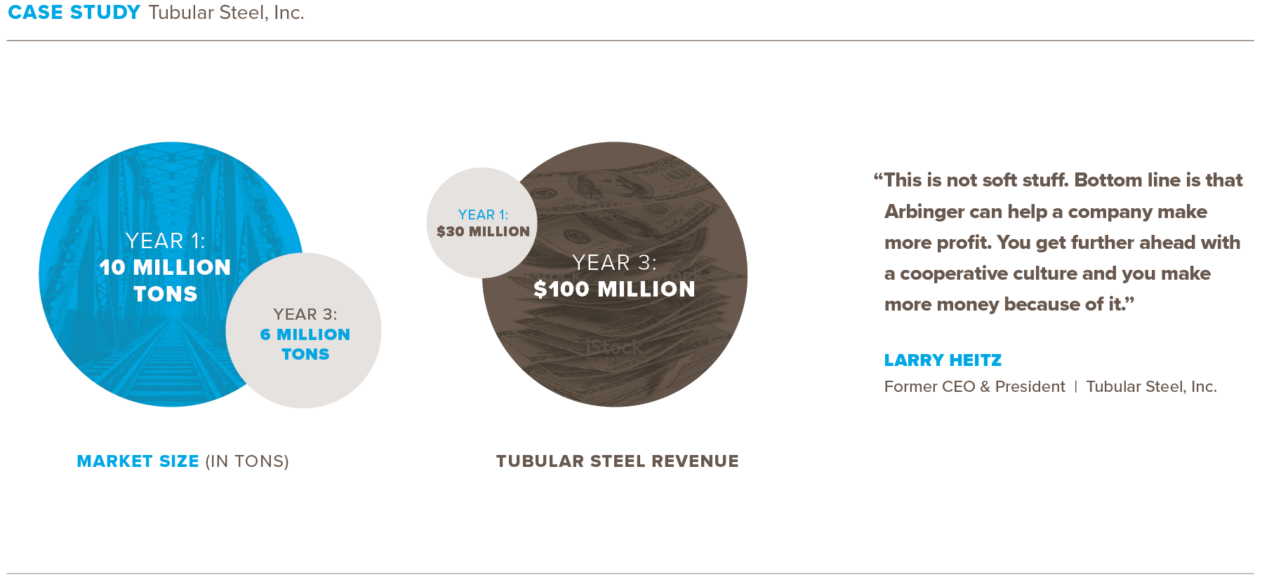 Tubular Steel’s employees transformed the company. Equipped with an outward mindset, team members devised new and innovative ways to adjust their work to improve producitvity and performance. Team members rallied to develop unique approaches to create competitive advantage in a declining market. As a result, during a time when the market for their products decreased dramatically from 10 million tons down to 6 million tons, the company's revenue nevertheless grew by a factor of four. “We grew from $30 million to over $100 million and more than quadrupled our profits,” said Mr. Heitz, who later became president and CEO.
